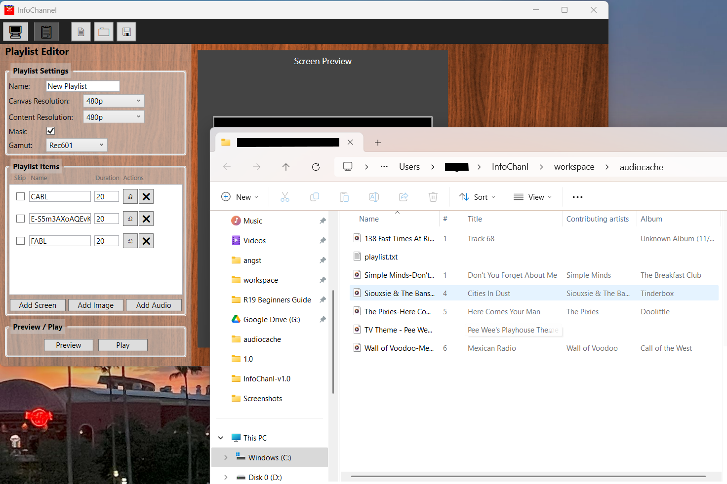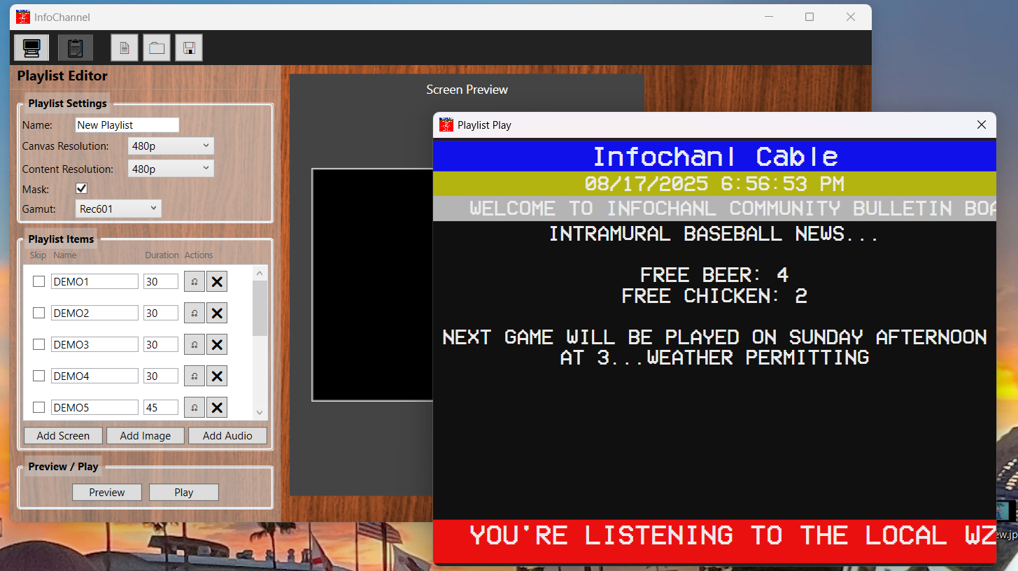 Create your own channel screens and channel playlist and play it as a video source for your streams or just package it up as a playlist file with your own audio playlist to pass along a mixtape that has its own cable channel. (Recipient will need this software to render it.)