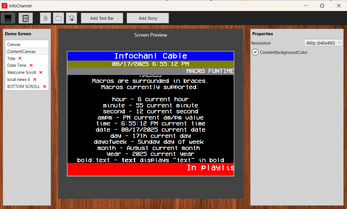 Use whatever fonts you have on your system to create text bars that scroll (or don't), Stories that can be stationary, scroll, or appear typed on the screen. With the exception of typewriter screens, you can also use macros to provide live text fragments in your screen.